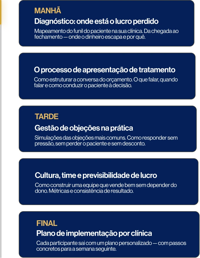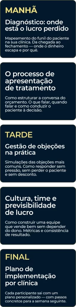 Não. É um workshop de trabalho. O foco é em processo, método e implementação. Você sai com um plano concreto para aplicar na sua clínica a partir da semana seguinte.
